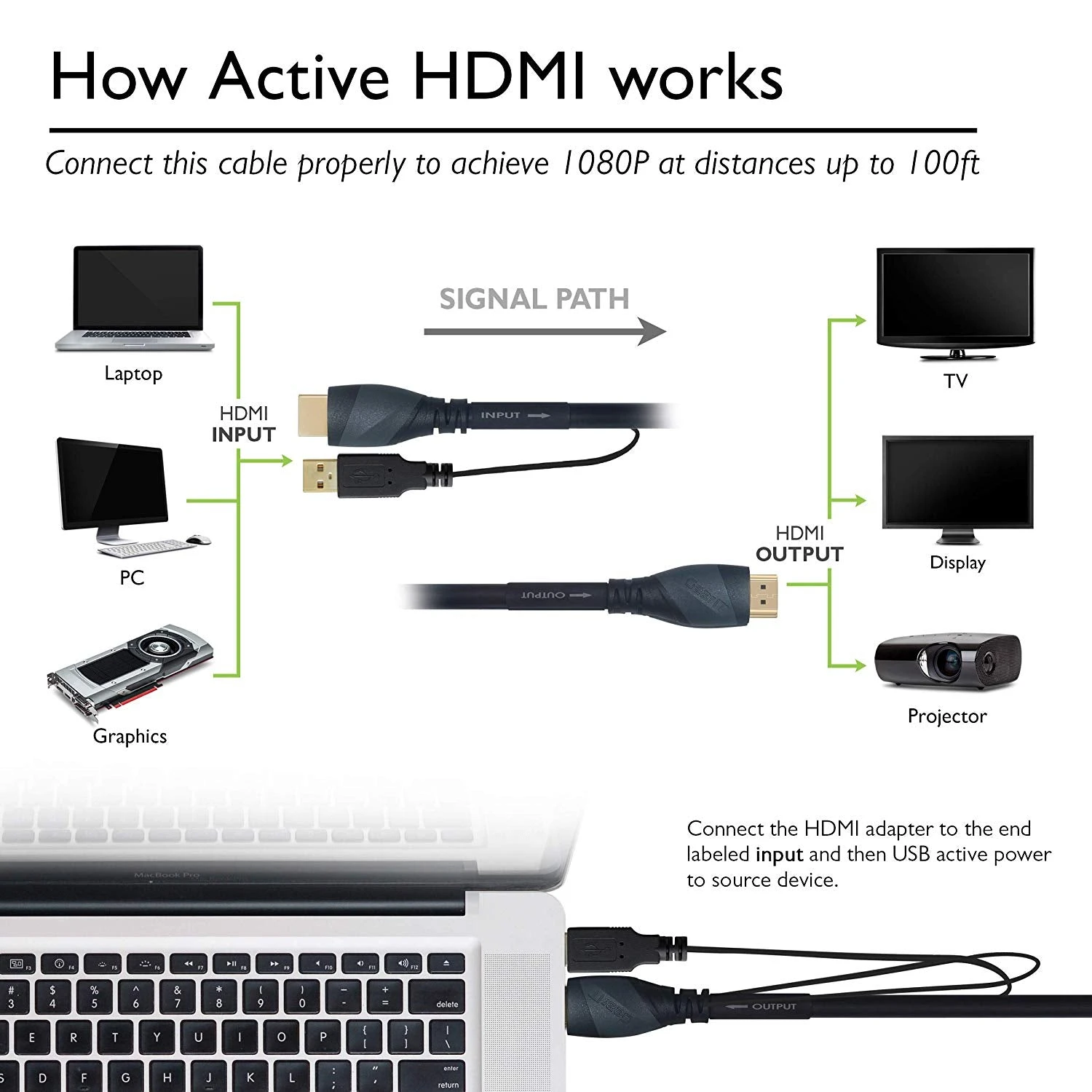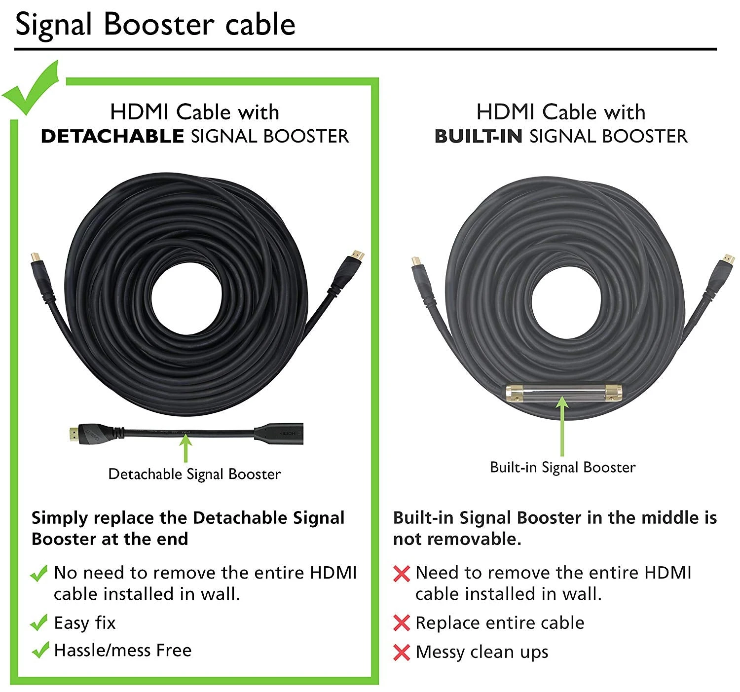 - Detachable Signal Booster Adapter (Must connect to HDMI “Input”) – Cable is directional (see description) Fully Shielded Heavy Duty 25AWG – CL3 Rated for In-Wall-Installations
