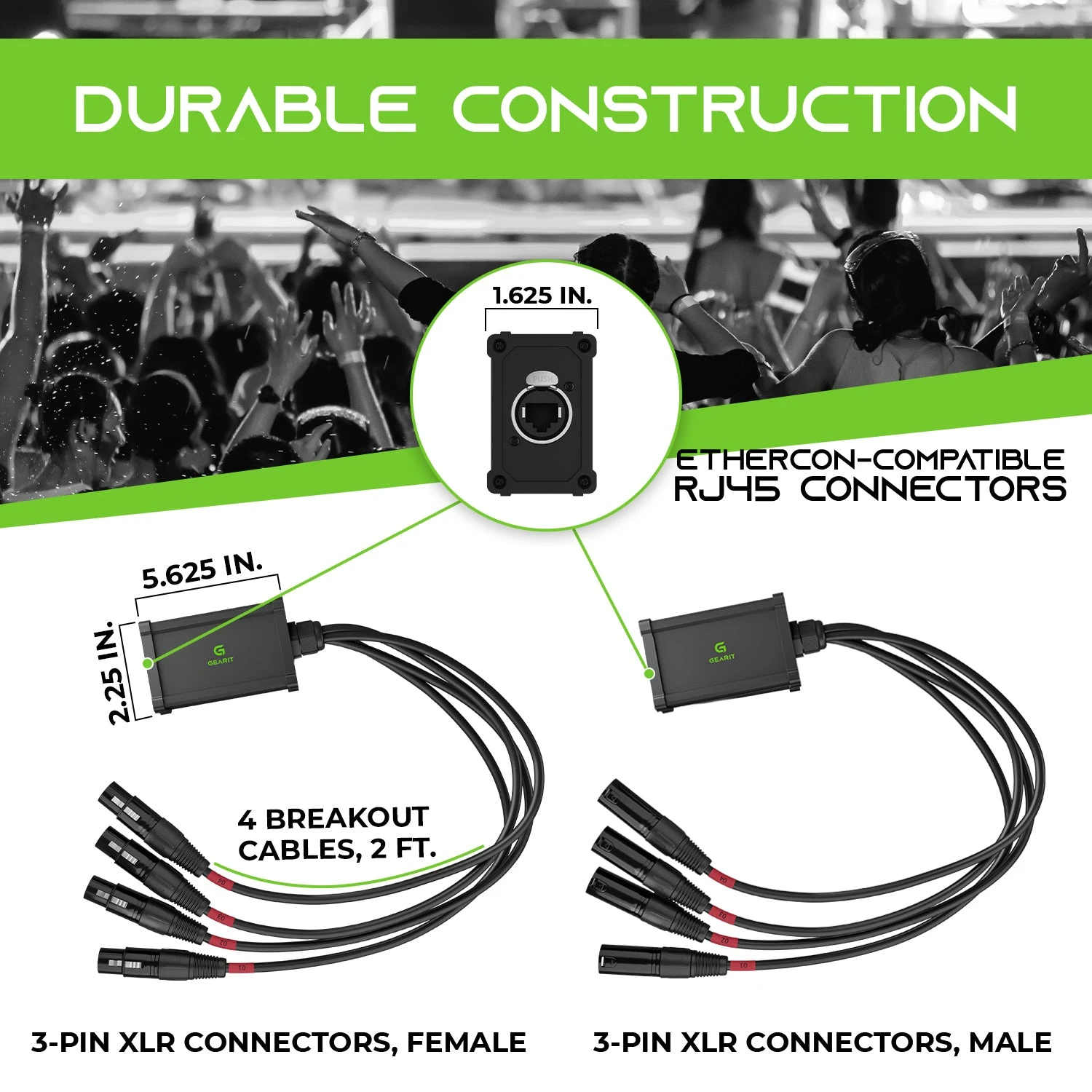 - 4-Channel XLR to Ethernet Adapters – Connect these two extender boxes with an Ethernet cable up to 300 ft. (sold separately) to carry up to 4 channels of XLR audio or 3-pin DMX control signals across stages, studios, DJ venues and live events over a single connection.
