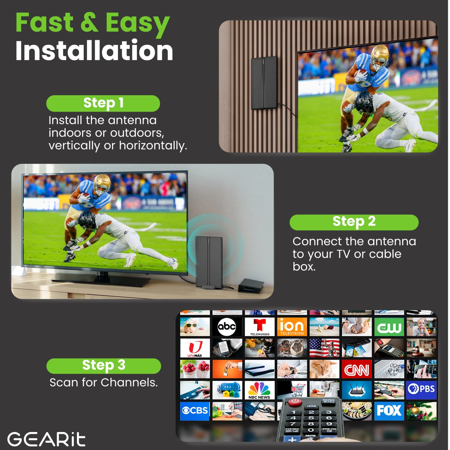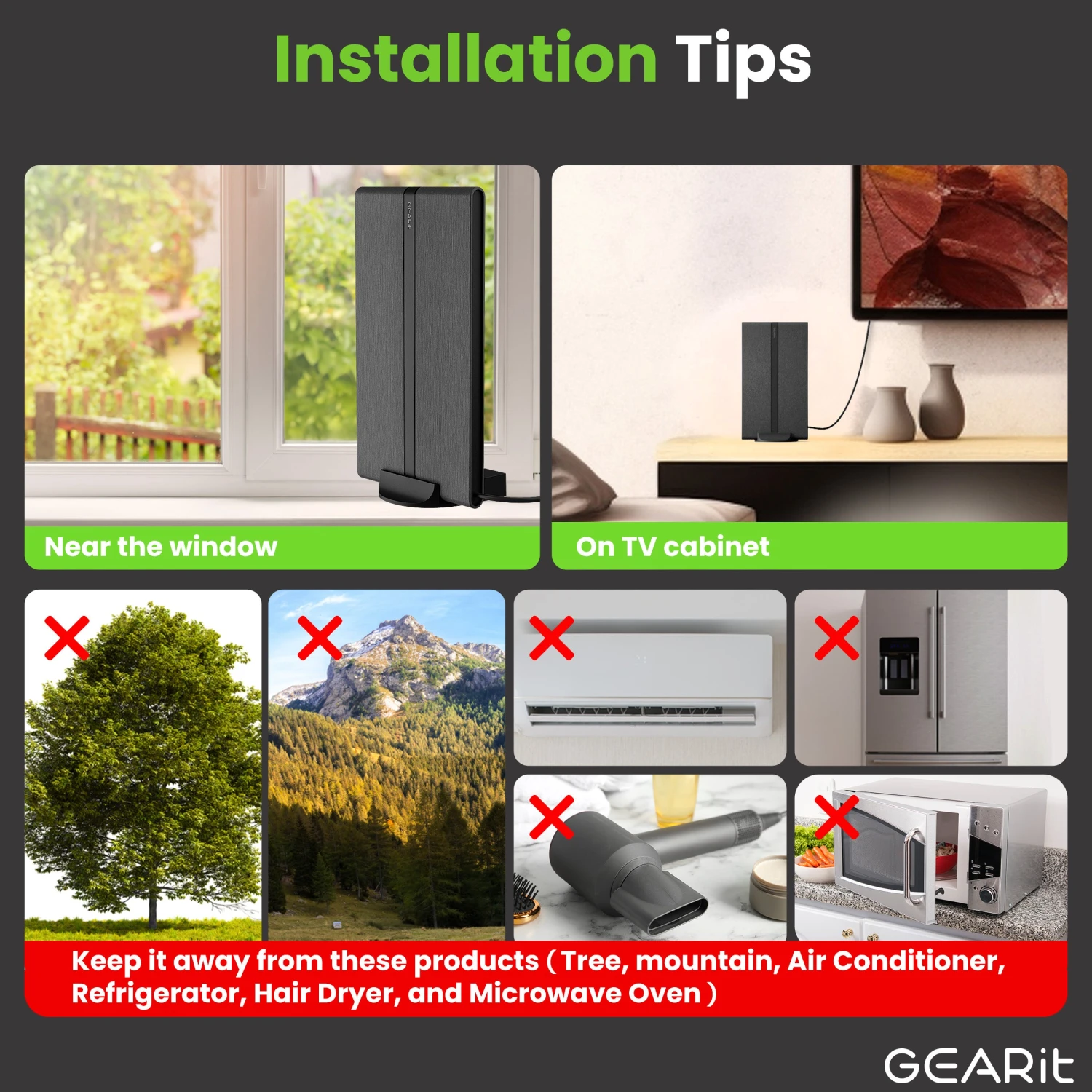 - All-Weather Omni-Directional Reception: GEARit’s digital antenna for indoor or outdoor TV setup ensures reliable omni-directional signal reception from any direction. With an IPX4 rating, it withstands rain, wind, or dust, delivering clear, high-definition picture quality in any weather.