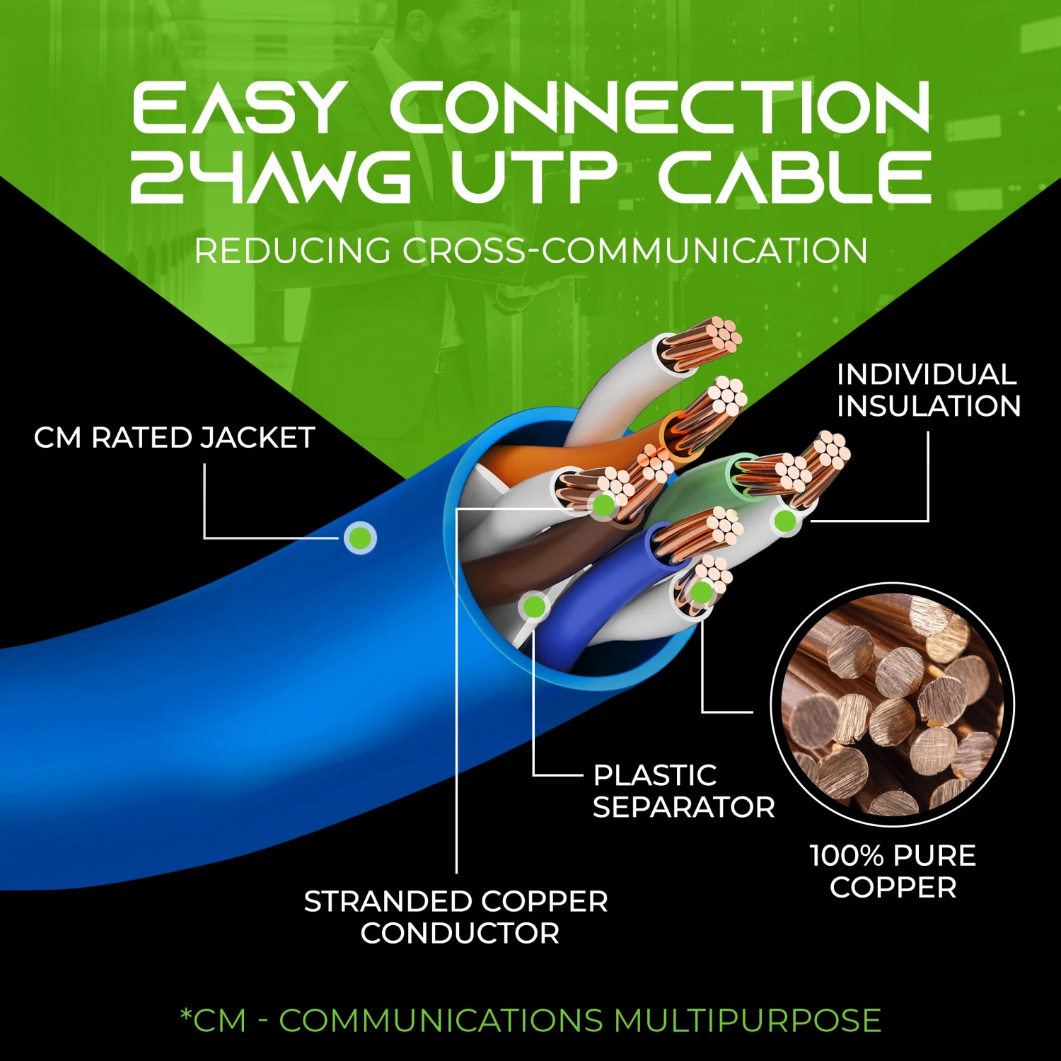- UTP 24AWG stranded conductors for flexibility, twisted in pairs and nested in a spline to minimize crosstalk, 50 micron gold-plated contacts for high-speed data transfer and corrosion resistance.
