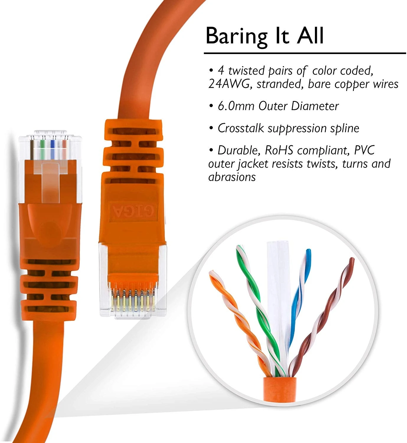 - UTP 24AWG stranded conductors for flexibility, twisted in pairs and nested in a spline to minimize crosstalk, 50 micron gold-plated contacts for high-speed data transfer and corrosion resistance