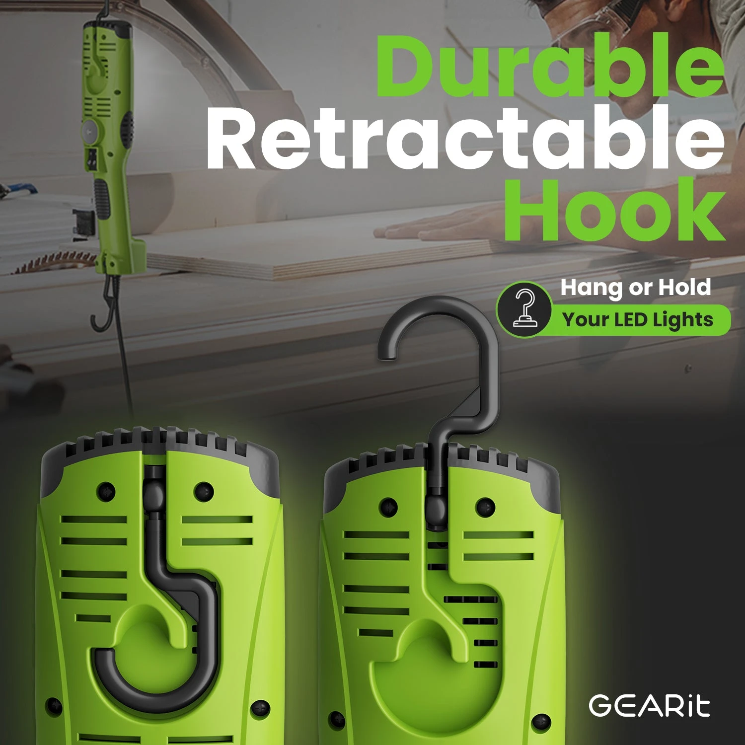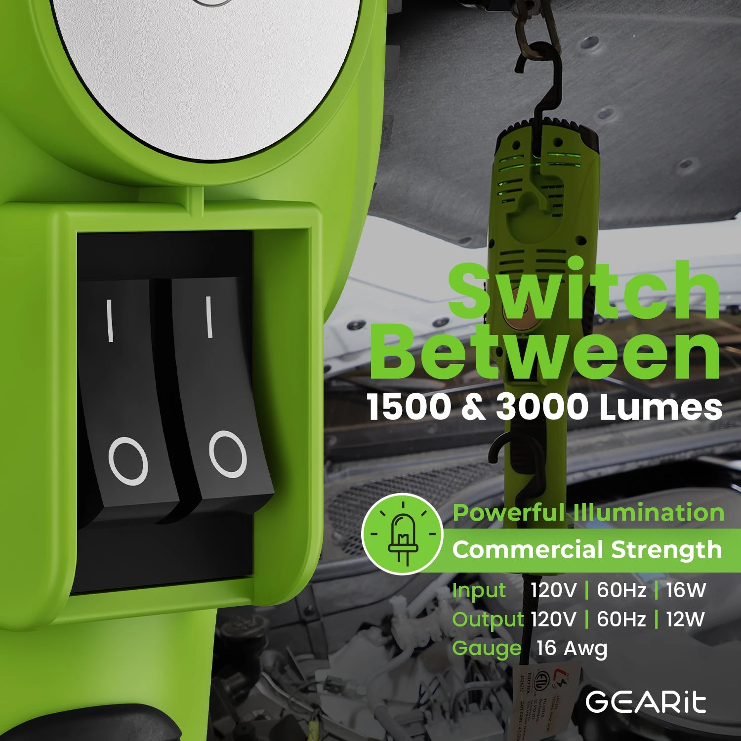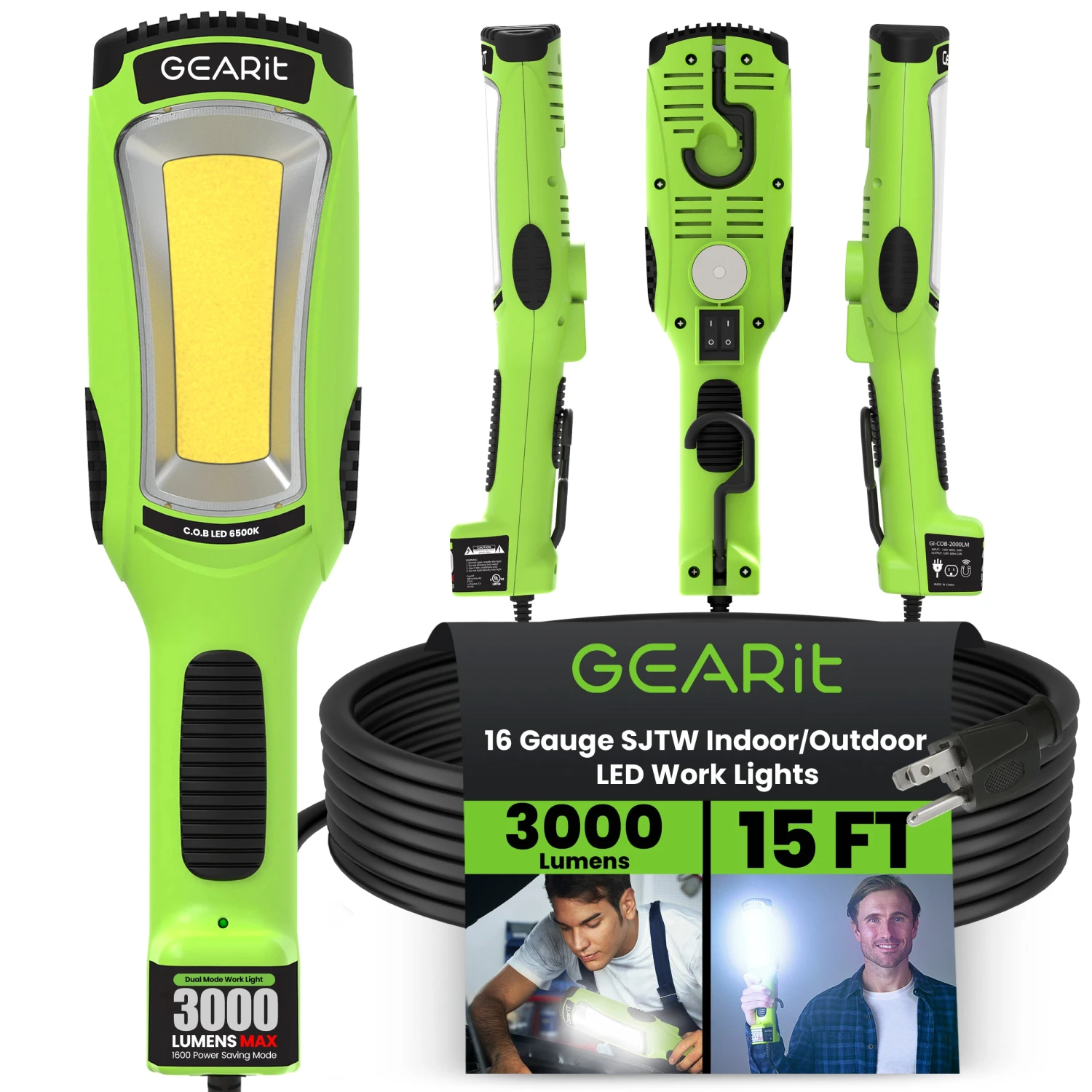 COB LED Work Light With Long Extension Cable, Green(Gearit Led Cob Work Light 2000 Lumen 15ft Extra Long 16 Gauge Sjtw Indoor Outdoor Extension Cable Green)
