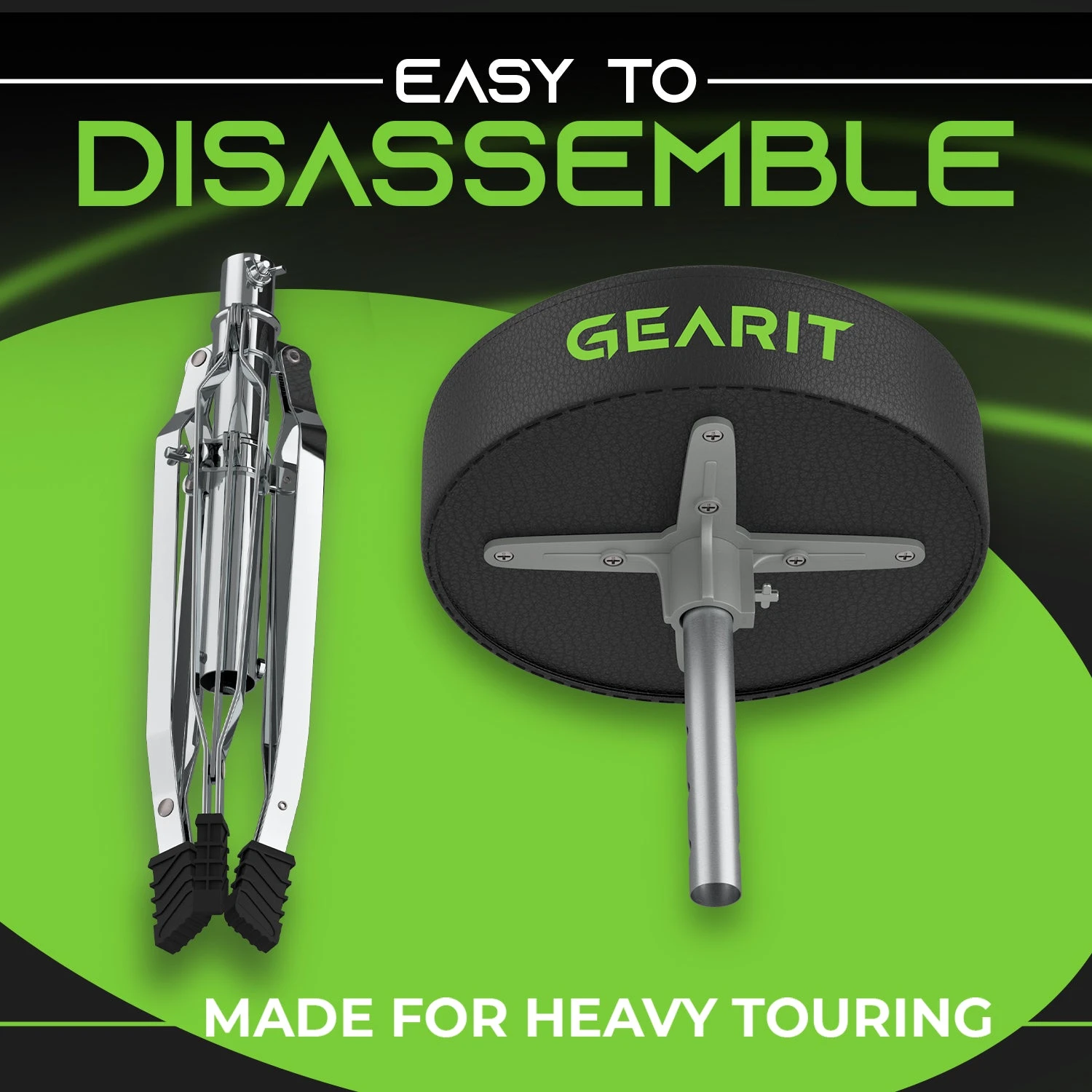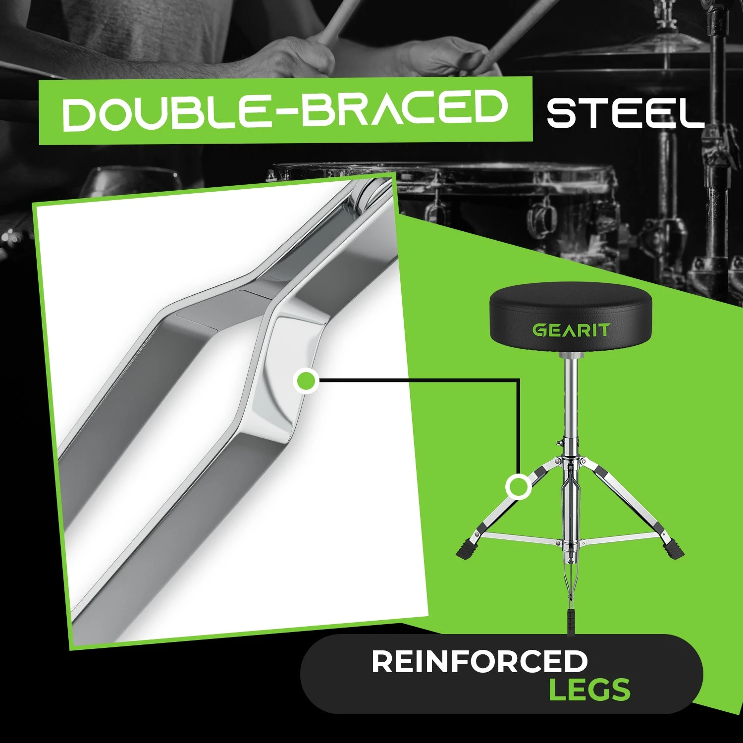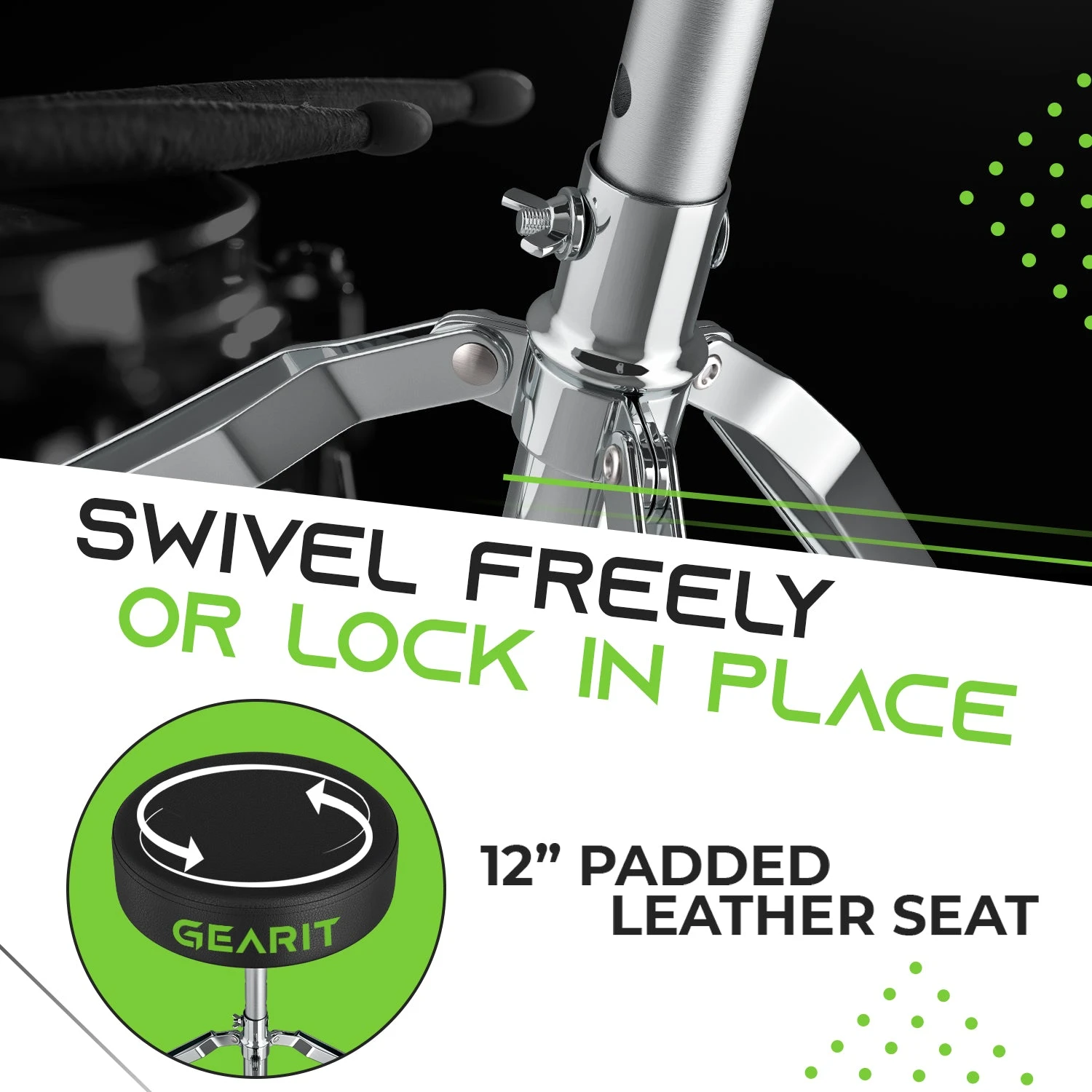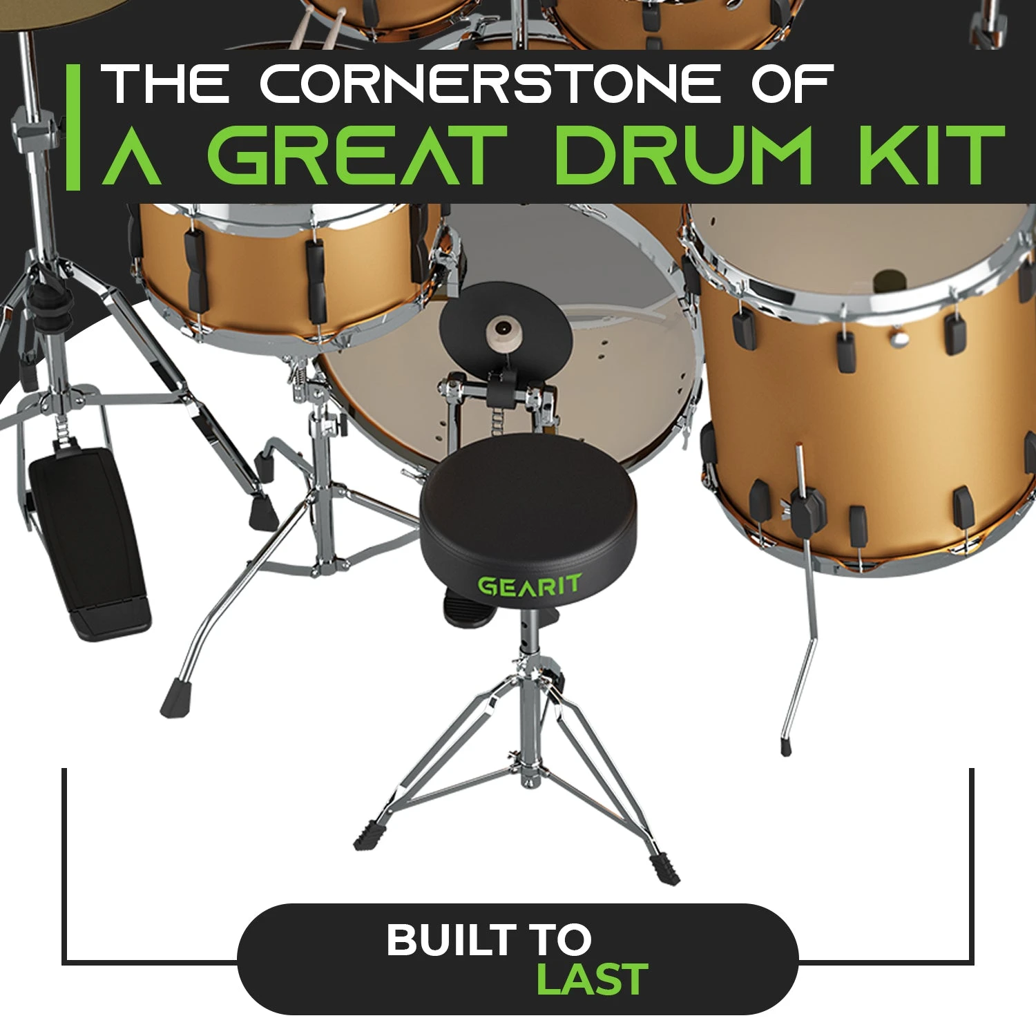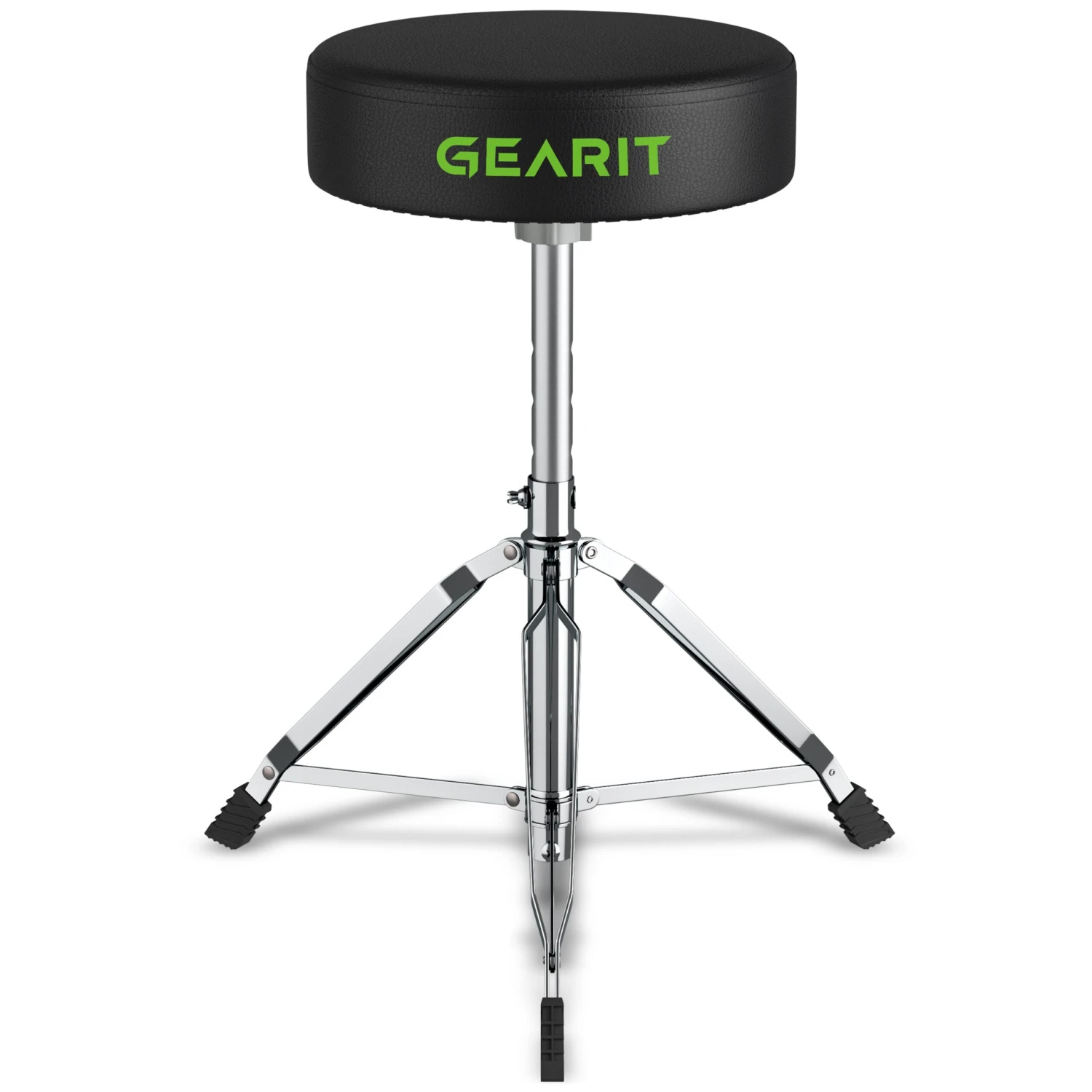 - GearIT Double-Braced Drum Throne With Round Top – This sturdy drum stool features reinforced steel legs and a thick, comfortable, padded leather seat. Easy adjustment options let you swivel freely or lock the seat in place, set your preferred height without slipping, and disassemble the entire throne for easy touring.