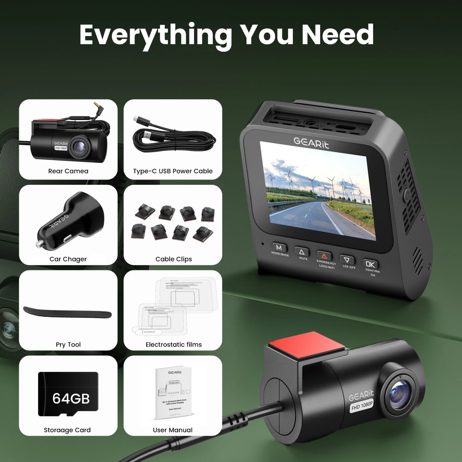 GEARit 4K Dual Dash Cam Front & Rear With WiFi GPS Night Vision 64GB Included(Gearit 4k Dual Dash Cam Front Rear With Wifi Gps Night Vision 64gb Included)