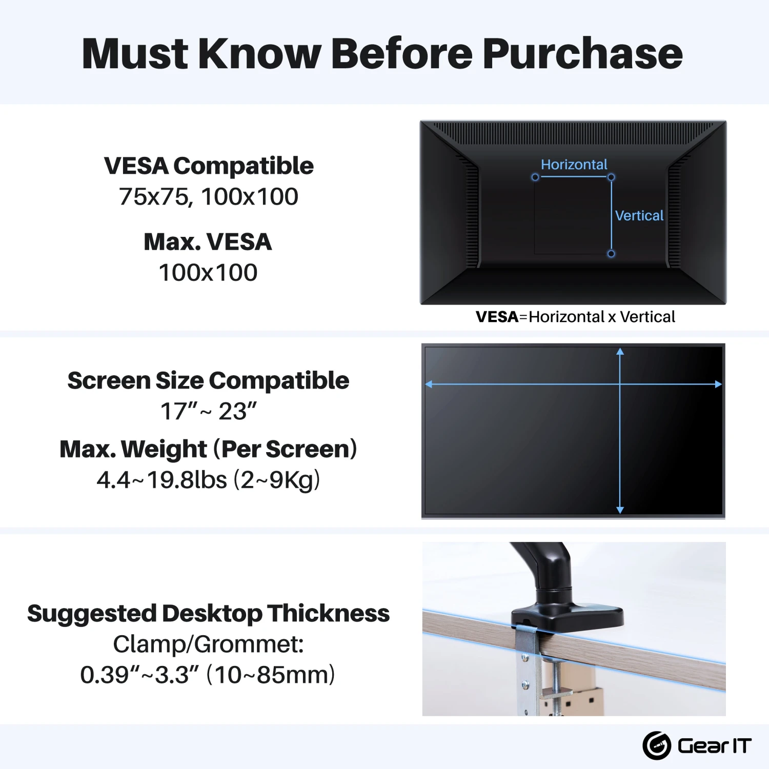 - [UNIVERSAL COMPATIBILITY] Works with all top monitor brands such as Samsung, LG, Dell, Acer, Viewsonic, BenQ, etc. Up to 32″ Monitor Panel wieighing up 19.8lbs. Fits Vesa holes 75x75mm, 100x100mm.